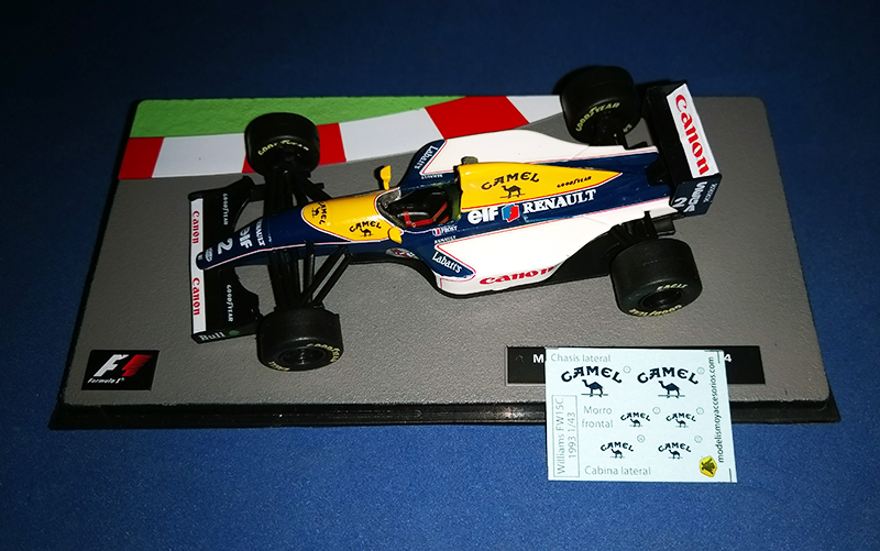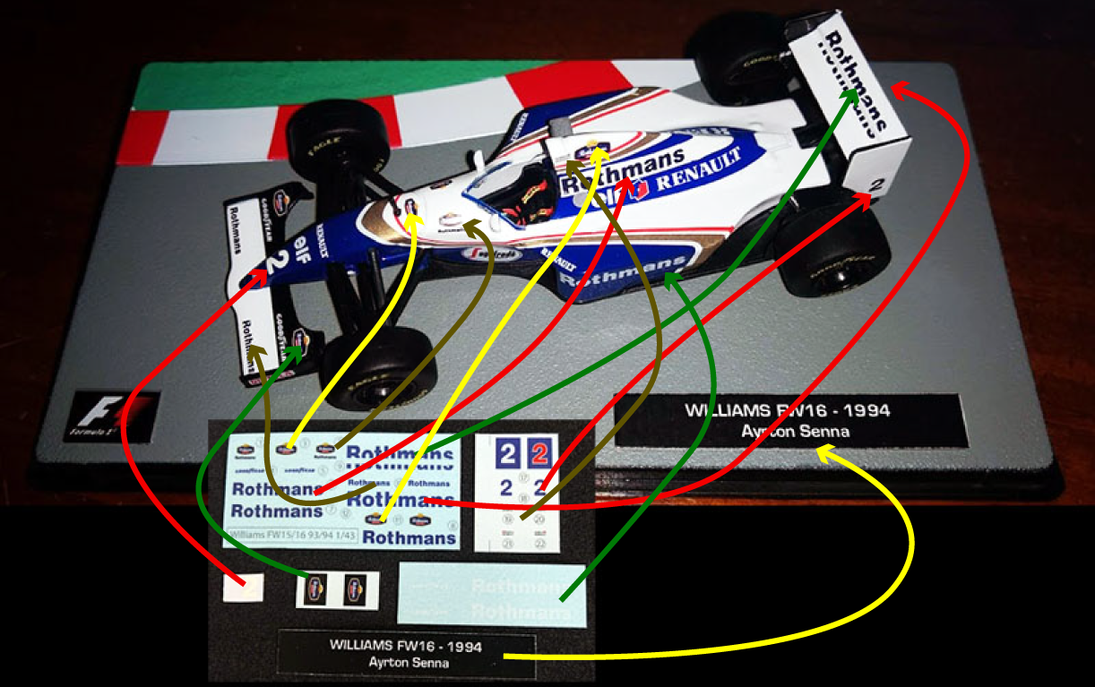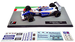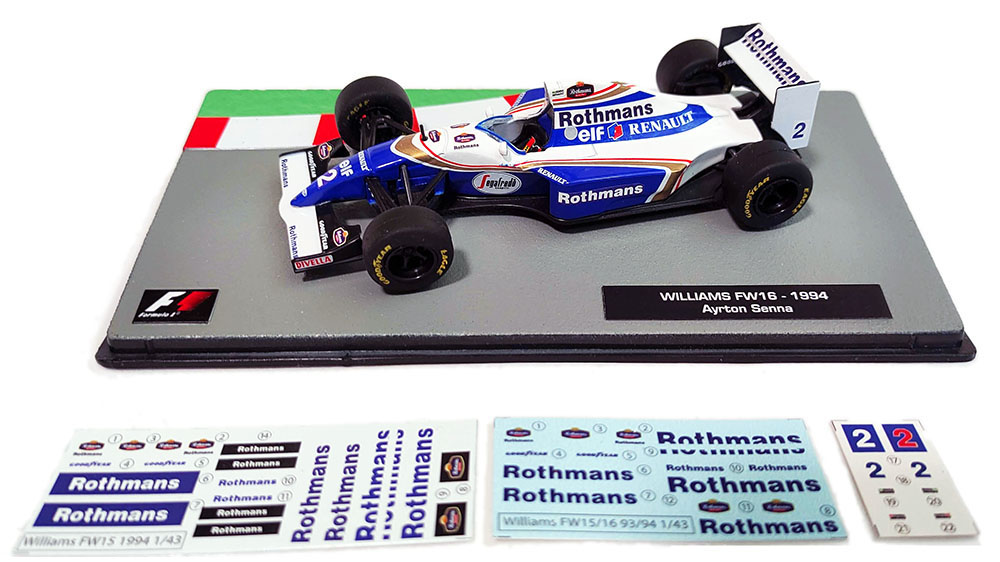 WILLIAMS FW16 (1994, conversión al No. 2, Senna, FASC # 69 Panini MEX), F1. Calcas deslizables al agua (impresión serigrafía/digital sobre fondo transparente). Incluye etiqueta para personalizar base MYA (MEX) D0217