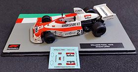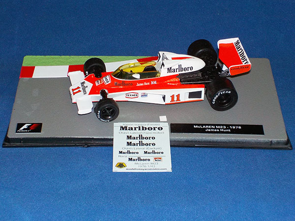 McLAREN M23 (Hunt), F1 (1975, FASC # 25 Panini MEX). Calcas deslizables al agua (impresión digital sobre fondo transparente) MYA (MEX) D0197