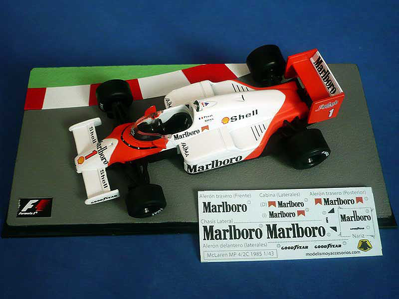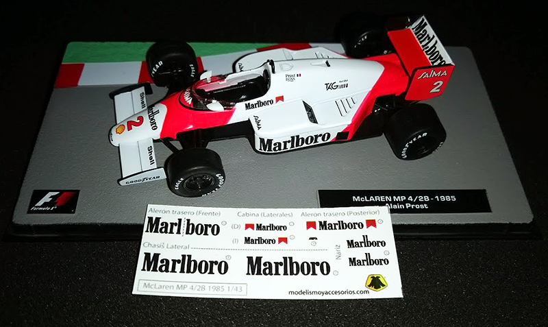 McLAREN MP 4/2B, F1 (1985, FASC # 50 Panini MEX). Calcas deslizables al agua (impresión digital sobre fondo transparente) MYA (MEX) D0205