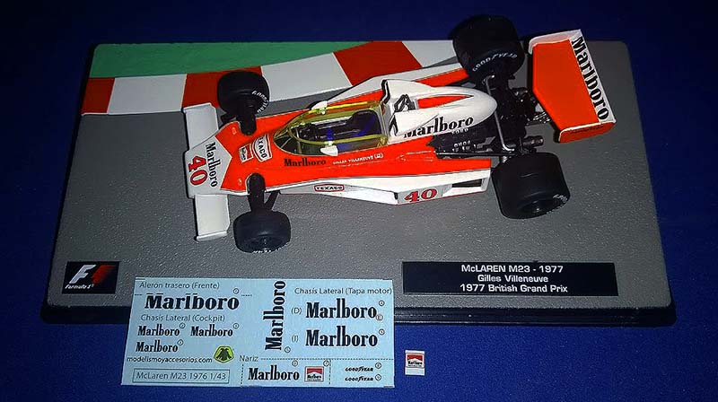 McLAREN M23 (Villenueve) F1 (1977, FASC # 55 Panini MEX). Calcas deslizables al agua (impresión digital sobre fondo transparente) MYA (MEX) D0206