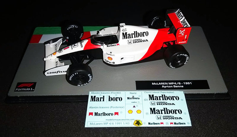 McLAREN MP 4/6, F1 (1991, FASC # 100 Panini ITA). Calcas deslizables al agua (impresión digital sobre fondo transparente) MYA (MEX) D0245