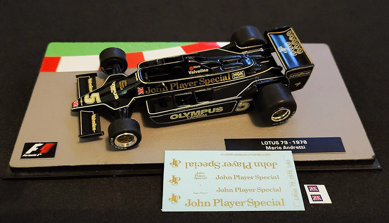 LOTUS 79, F1 (1978, FASC # 29 Panini MEX). Calcas deslizables al agua (impresión digital sobre fondo blanco/tinta oro sobre fondo transparente) MYA (MEX) D0257