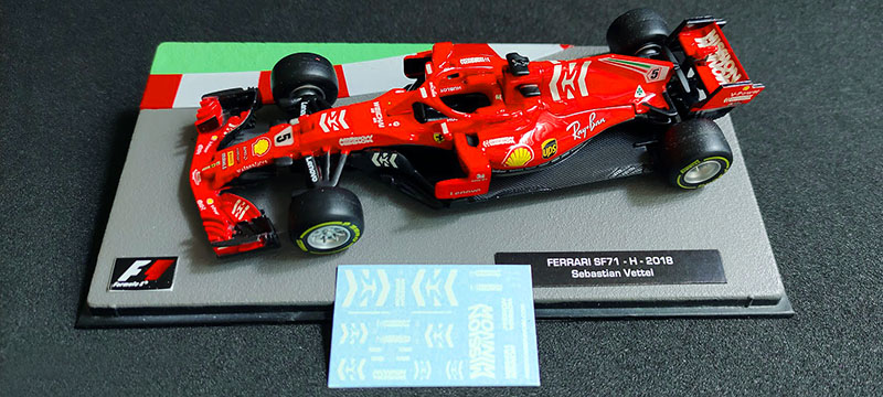 FERRARI SF71-H, F1 (2018, FASC # 137 Panini MEX, funcionan también para el auto de la marca Bburago y Shell-Bburago). Calcas deslizables al agua (impresión serigrafía sobre fondo transparente) MYA (MEX) D0260