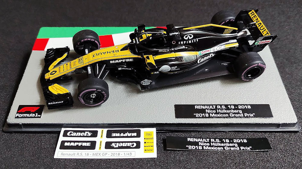 RENAULT R.S. 18 (2018, versión GP de México, FASC # 144 Panini MEX), F1. Calcas deslizables al agua (impresión digital sobre fondo blanco). Incluye etiqueta para personalizar base MYA (MEX) D0267