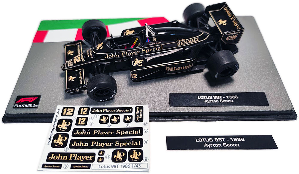 LOTUS 98T, F1 (1986, FASC # 148 Panini MEX). F1. Calcas deslizables al agua, conversión al auto de Senna (impresión digital sobre fondo blanco). Incluye etiqueta para personalizar la base. MYA (MEX) D0274