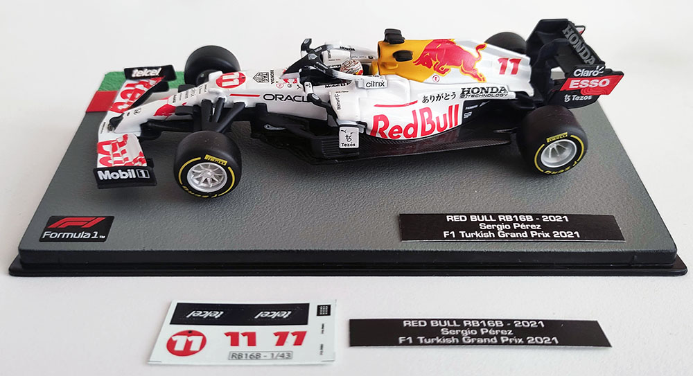 RED BULL RB16B, conversión al #11 Sergio Pérez (2021, para Turkey Signature Edition, Bburago), F1. Calcas deslizables al agua (impresión digital sobre fondo blanco). MYA (MEX) D0276