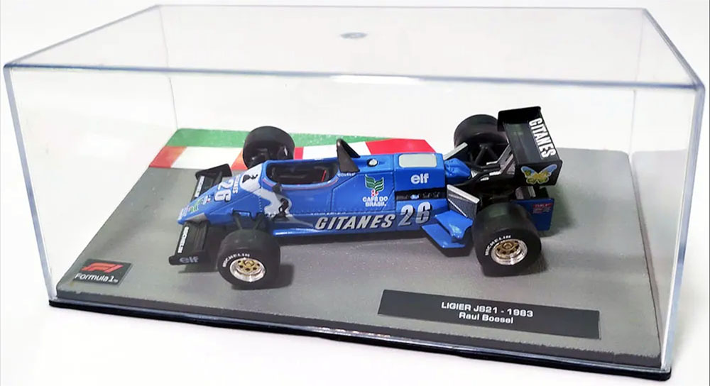- Ligier Gitanes JS21 (Raul Boesel, 1983 / Incluye base-diorama y capelo protector) ***CUSTOM DECORACIÓN COMPLETA DE PATROCINIO GITANES*** IXO (CHN) DIEC2114